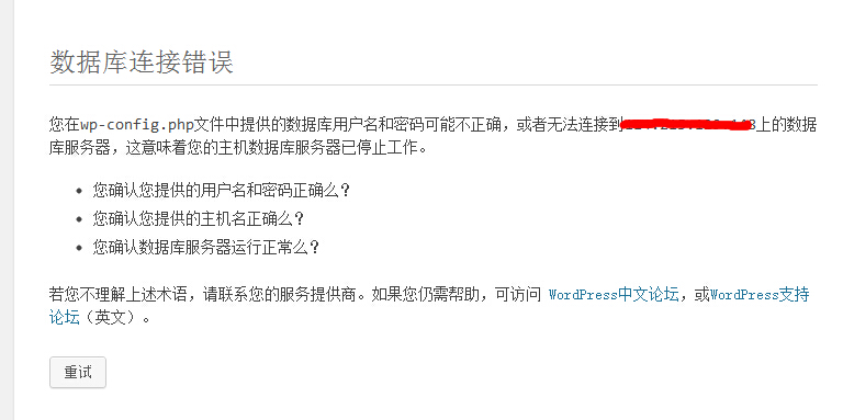 论坛用的discuz,安装成功了,但是就是这个博客,怎么都无法安装成功,显示数据库连接错误,数据库的用户名和主机我都是按照建站时填写的信息填写的对照了好几遍,不会有错误,如果有错误怎么discuz都安装成功了,wordpress怎么就安装不成功,不清楚原因在哪里,请问哪位大侠能指点迷津吗?多谢了