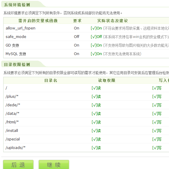 下一步 服务器信息和系统检测 点击"继续"