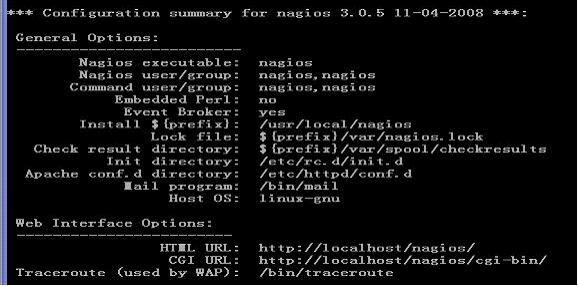 [root@wdOS src]# tar -zxvf nagios-3.0.5.tar.gz //解压缩源码包 [root@wdOS src]# cd nagios-3.0.5 //进入解压缩后默认生成的nagios-3.0.5目录 [root@wdOS nagios-3.0.5]# ./configure --prefix=/usr/local/nagios //配置安装路径