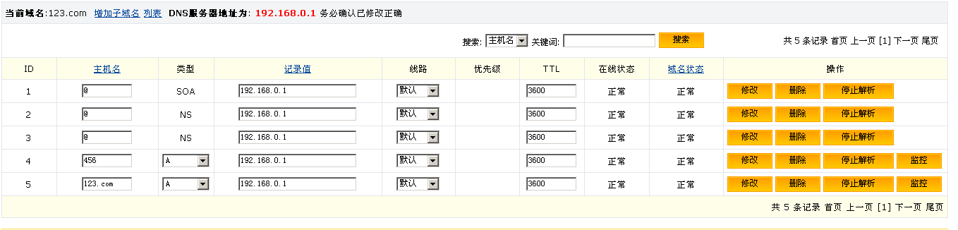 自己在dns里面建立的,将它指向到192.168.0.1,我想客户机应该能找到,但是现在找不到,所以才问。莫非这个只是一个助手,而要完成我的目的的话,必须架设一个DNS服务器?我的目的是:wdos提供DNS服务,将一个域名指引到WDOS所在服务器,然后设置其他客户机的DNS地址为WDOS的IP,从而达到实验的目的。