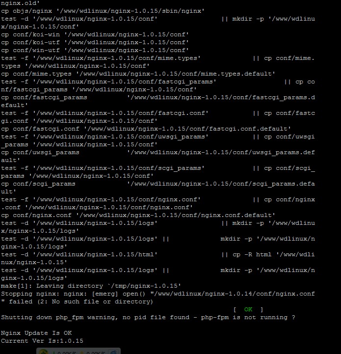 用这脚本默认升级到1.0.14后,没能正常成功升级,重启后探针查看依然还是原来的1.0.12版本,后台直接运行sh nginx_up.sh 1.0.15后,网站提示502错误。