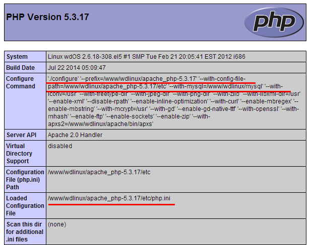 红线标注的位置示意的这些路径基本都是之后会用到的。 从 “./configure”里可以得知php-config的位置,于是运行phpize: # /www/wdlinux/apache_php-5.3.17/bin/phpize (要修改成自己的路径,比如AMH的一般是/usr/local/php/bin/phpize)