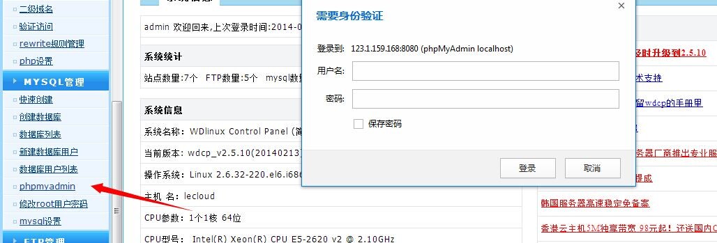 我在面板点phpmyadmin会出现一个输密码的框子,咋回事?并且输入了就没反应了,也进不去面板,求解。。