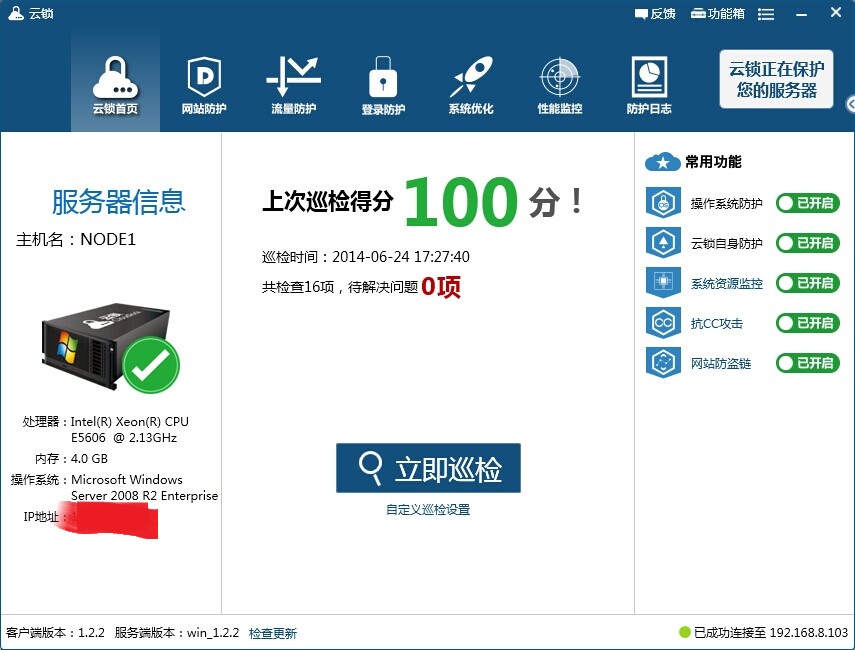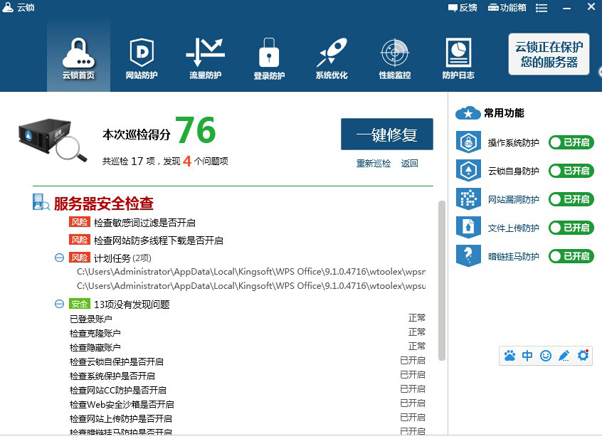 云锁集防护、监控、管理三维为一体,一键巡检服务器操作系统和网站安全,实时掌握服务器和网站安全状态,最快发现可疑及潜在问题,并进行修复,同时开放六大功能模块,让用户灵活掌控服务器状态: