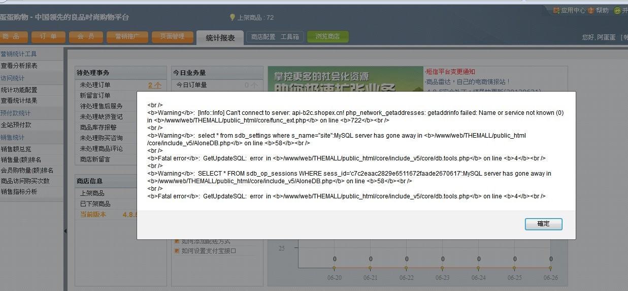 然后我很多人说是配置的问题 ,需要重新安装系统,然后我就删除数据库和网站 重新安装SHOPEX,还是不行报错,报另一种错误。