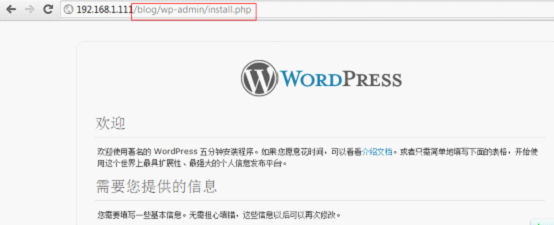 编辑好配置文件之后,/usr/sbin/nginx启动nginx服务,在本机浏览器输入 http://192.168.1.111/wp-admin/install.php就可以看到wordpress的安装页面了: