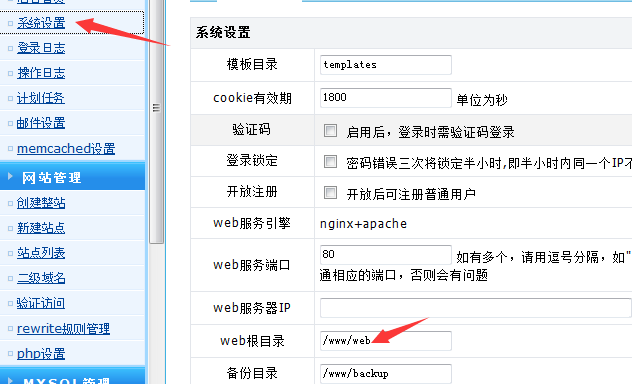 3、再到“后台——系统设置——web站点根目录”,恢复成“/www/web”确定。