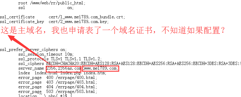 同一个配置文件里面,如何分别加载两个不的SSL域名证书?一个主域名,一个是绑定域名,如果单独加载一个域名SSL证书,可以正常用https访问!