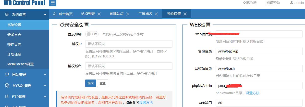 分享一个简单解决安装wdcp V3后phpmyadmin无法打开的问题,本人创建站点后去点phpmyadmin,返回404.有高手说因为网站占用80端口导致的。我想我干脆也用web访问吧。就用二级域名新建一个站点,目录填/www/web/default/pma_xxxxxxxx(系统设置-web设置-phpmyadmin目录)。创建后解析这个二级域名,解析成功后打开就可以用这个域名访问phpmyadmin了。