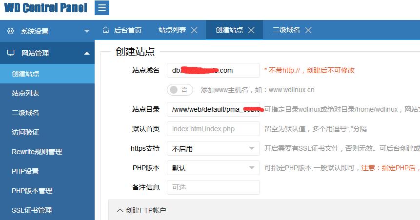 目录填/www/web/default/pma_xxxxxxxx,创建后打开ip就可以操作phpmyadmin了。操作完了再把default站点关闭。下次使用时打开。