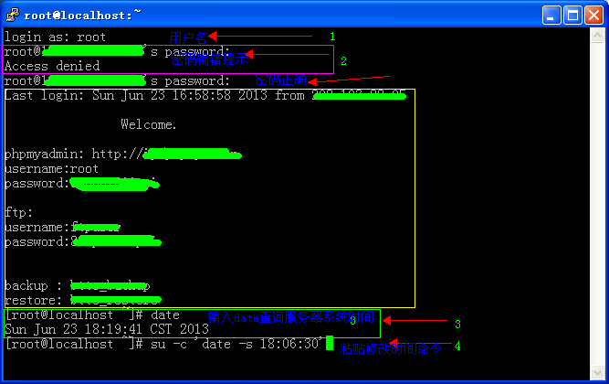 输入用户名回车,复制密码在输入框直接点右键即可粘贴,回车后输入: date 查询服务器时间是否和本机时间相符,