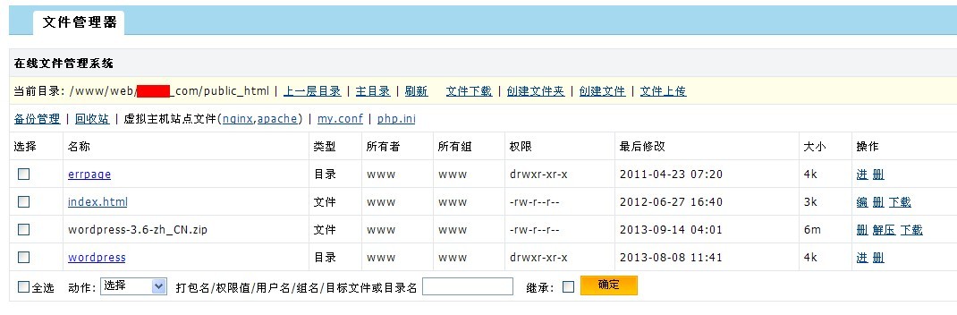 我以为正常可以了,然后我就把wordpress-3.6-zh_CN.zip程序传到public_html根目录下,接着就在线解压,解压后我运行域名还是显示,我这个无奈啊,大半夜还出这样的事,于是检查根目录文件