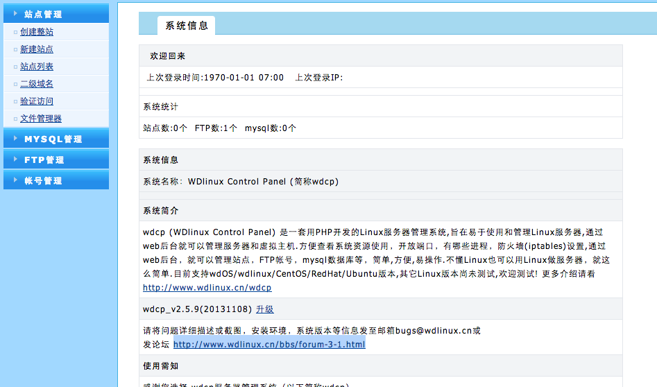 今晚早点的时候我登入了wdcp在工作,然后出去吃了个饭,回来wdcp说我登录超时,然后我再登陆发现怎么试都是密码错误,然后我就按照论坛指南把密码重置为wdlinux.cn 还是不行,然后我把用户名改了一下,能登录了,不过登陆进去是下面的界面...不是管理员帐号,而且里面网站什么都没有了求救