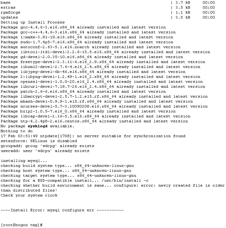 1 提供详细,如系统版本,wdcp版本,软件版本等及错误的详细信息,贴上论坛或截图发论坛 2 做过哪些操作或改动设置等 温馨提示:信息不详,很可能会没人理你!论坛有教程说明的,也可能没人理!因为,你懂的 [求助] sh in.sh安装时报Install Error: mysql configure err 急救!!