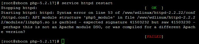 这个页面讲的方法增加扩展,执行完 cd, ./configure, make, make install之后。最后一步是重启apache,service httpd restart, 在这一步出现问题了,start-----Failed。