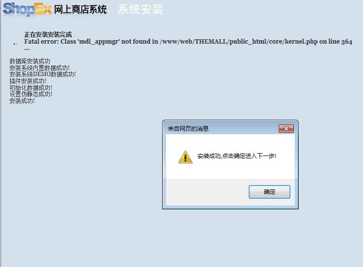 然后我很多人说是配置的问题 ,需要重新安装系统,然后我就删除数据库和网站 重新安装SHOPEX,还是不行报错,报另一种错误。