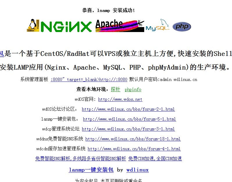 无论新建各种站点和默认站点,都是访问到“恭喜,lnamp 安装成功!”这个页面。